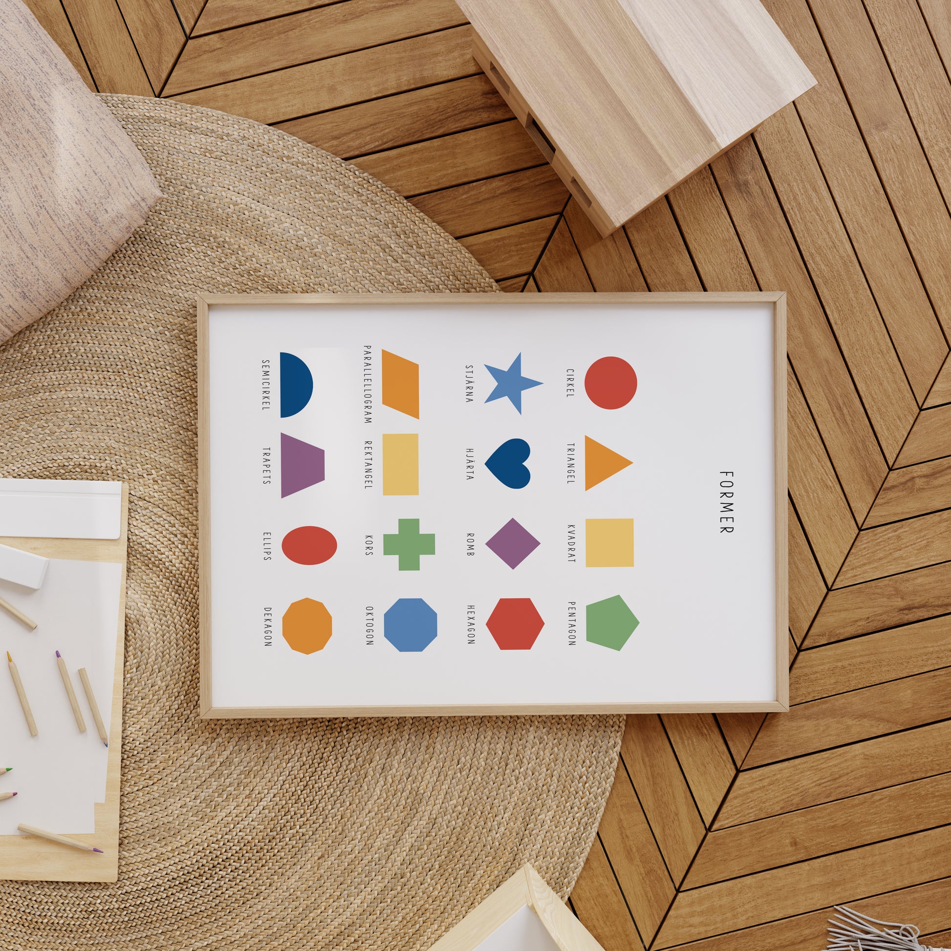 Intresset för former väcks ofta redan i förskoleåldern. Barn tycker om att peka, känna och rita av cirklar, kvadrater, trianglar och andra figurer. Genom att ha postern synlig i barnets miljö blir inlärningen en naturlig del av vardagen och hjälper till att bygga en trygg förståelse för geometri redan från start.
